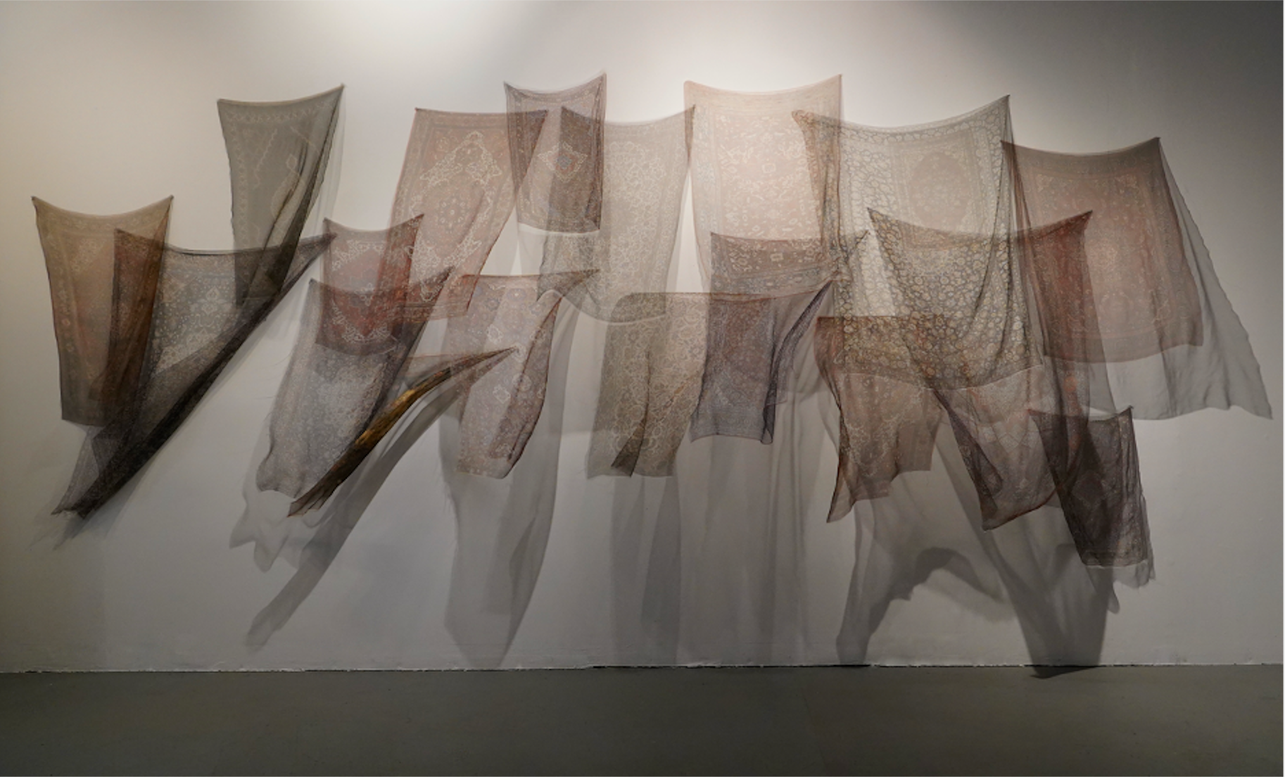 Thinking About Migration are prints of Persian rugs on gauze fabric. They blow and turn gently like ethereal spirits from a fan placed in the corner of the room that personifies the imagination of magic carpets. In old Persian stories magic carpets are woven with magic threads that are able to transport anyone to anywhere in the world instantly. The rugs, and their delicate gauzy materiality suggest bodies of Iranian migrants and the precarity of migration. Their delicate motion and scale creates an ambivalent sensation—simultaneously of overwhelming vulnerability and loss while suggesting a calm freedom swaying easily in the wind. As the wind continues to blow on these rugs the gauze ever so slowly begins to unravel itself when they move.