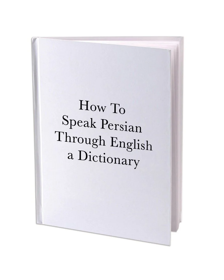 Thinking about my relationship to the Persian language and how I relate to my family I made the project How To Speak Persian Through English. This project is a dictionary I created that contains quasi-homophones, for example, the English words “Good Office” sounds roughly like Khoda hafez, meaning Goodbye. Even though the Persian Kh sounds more like an H than a G, when said rapidly, and in the right context of casual conversation, this difference is overlooked, and the word is understood by a native speaker. This project allows the reader to communicate and “speak” someone else's language without the inconvenience of having to learn it. How To Speak Persian Through English came out of the experience of relearning Persian, my method of remembering new words was through English word combinations. I think of this project as a metaphor of how I connect to my family and culture by coming from a different place and speaking a different language while trying to meet them in the middle. This project comments in a humorous way on my own search for place, how migrants and foreigners are always feeling out of place and trying to connect to language on different levels by navigating disjoint meaning, where good office has nothing to do with goodbye.